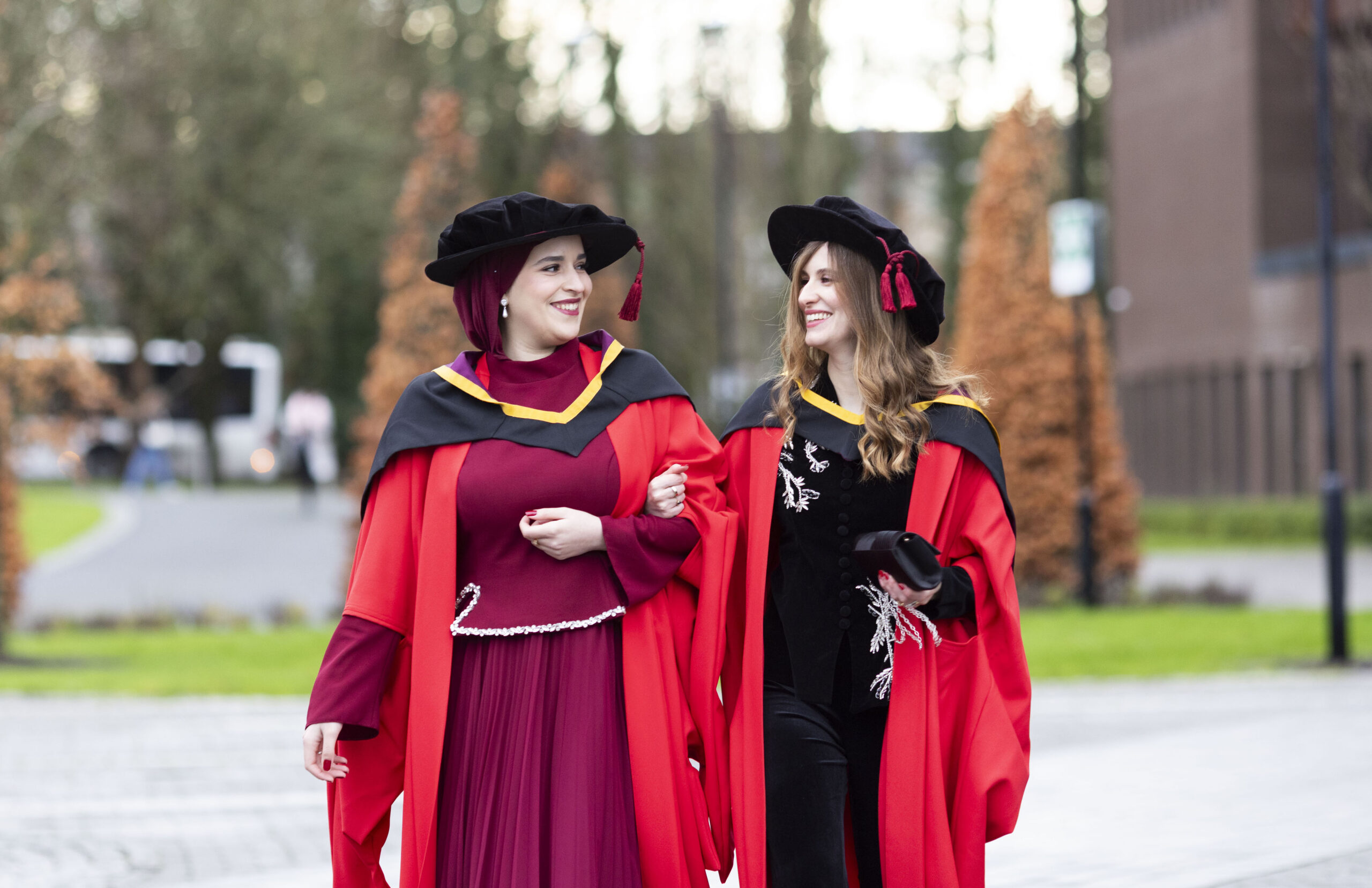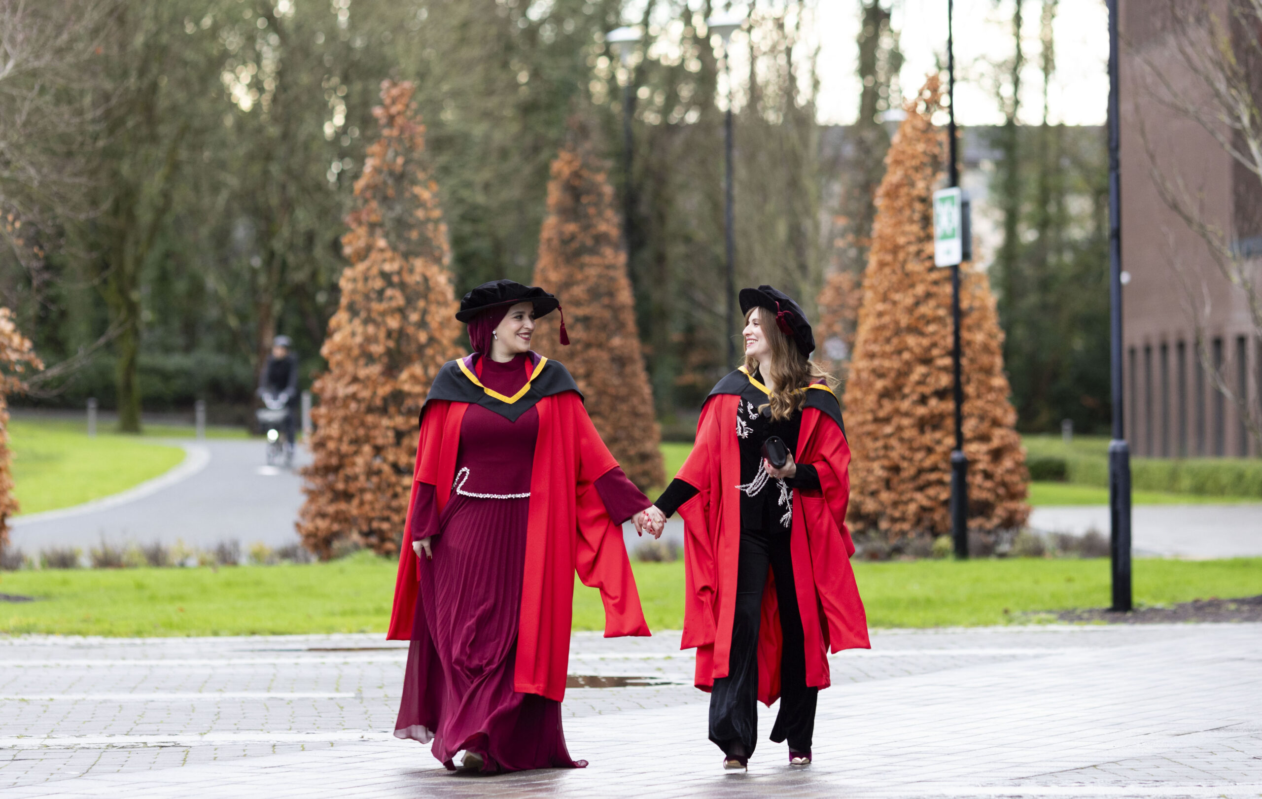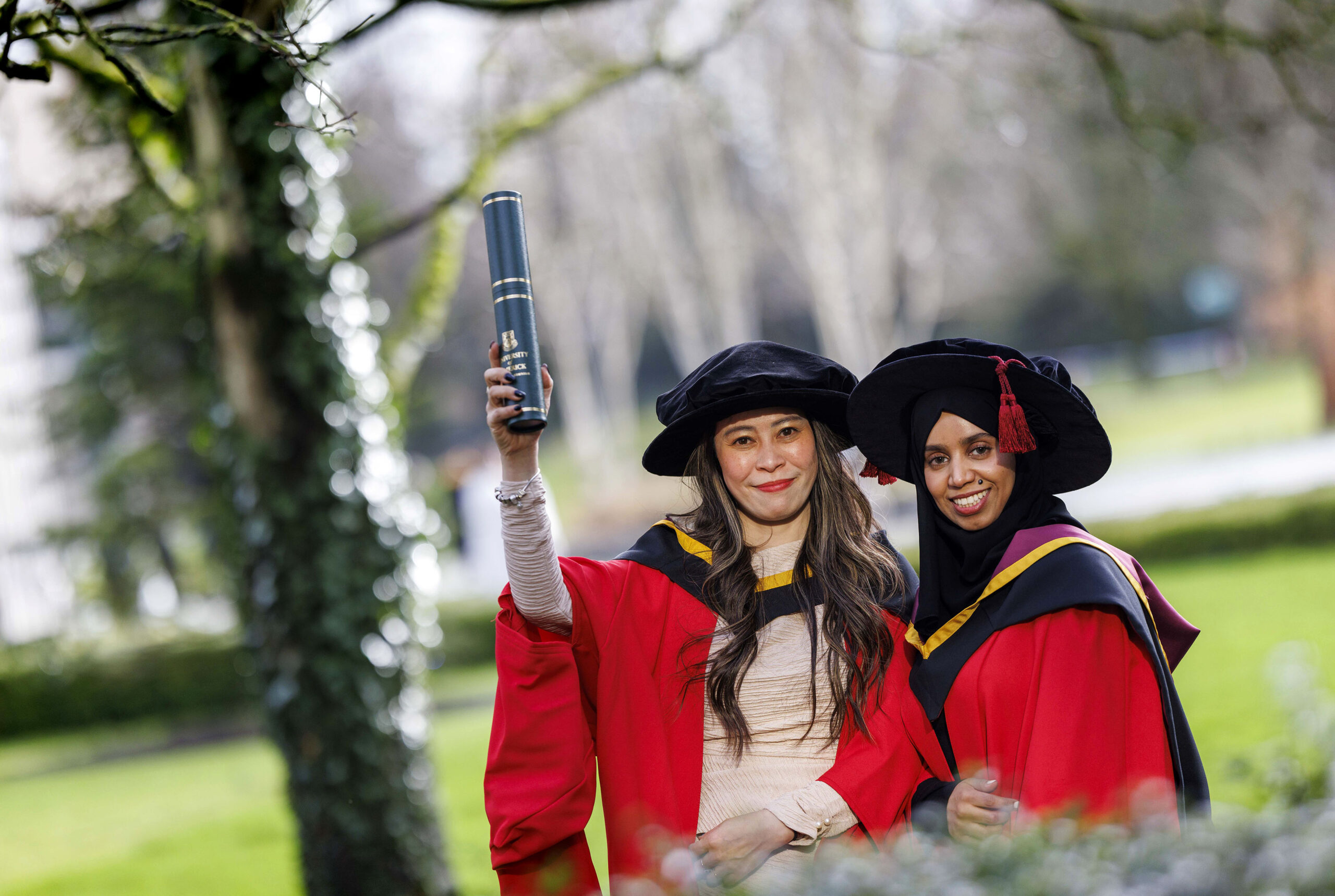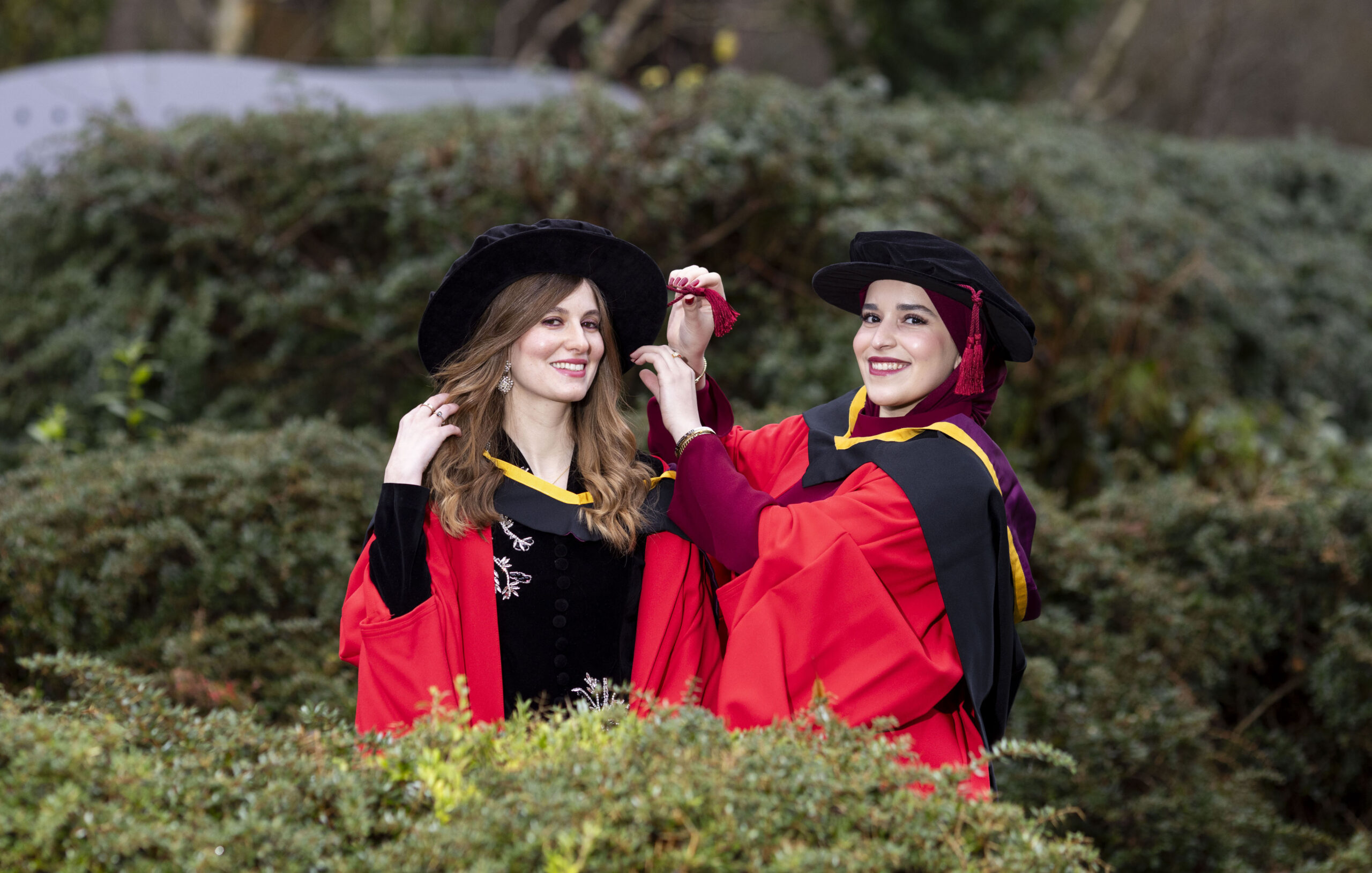 Soumia Chirouf (right) PhD in Linguistics with her friend Rayiane Filali at UL's 2026 winter conferring ceremony. Photo: Arthur Ellis