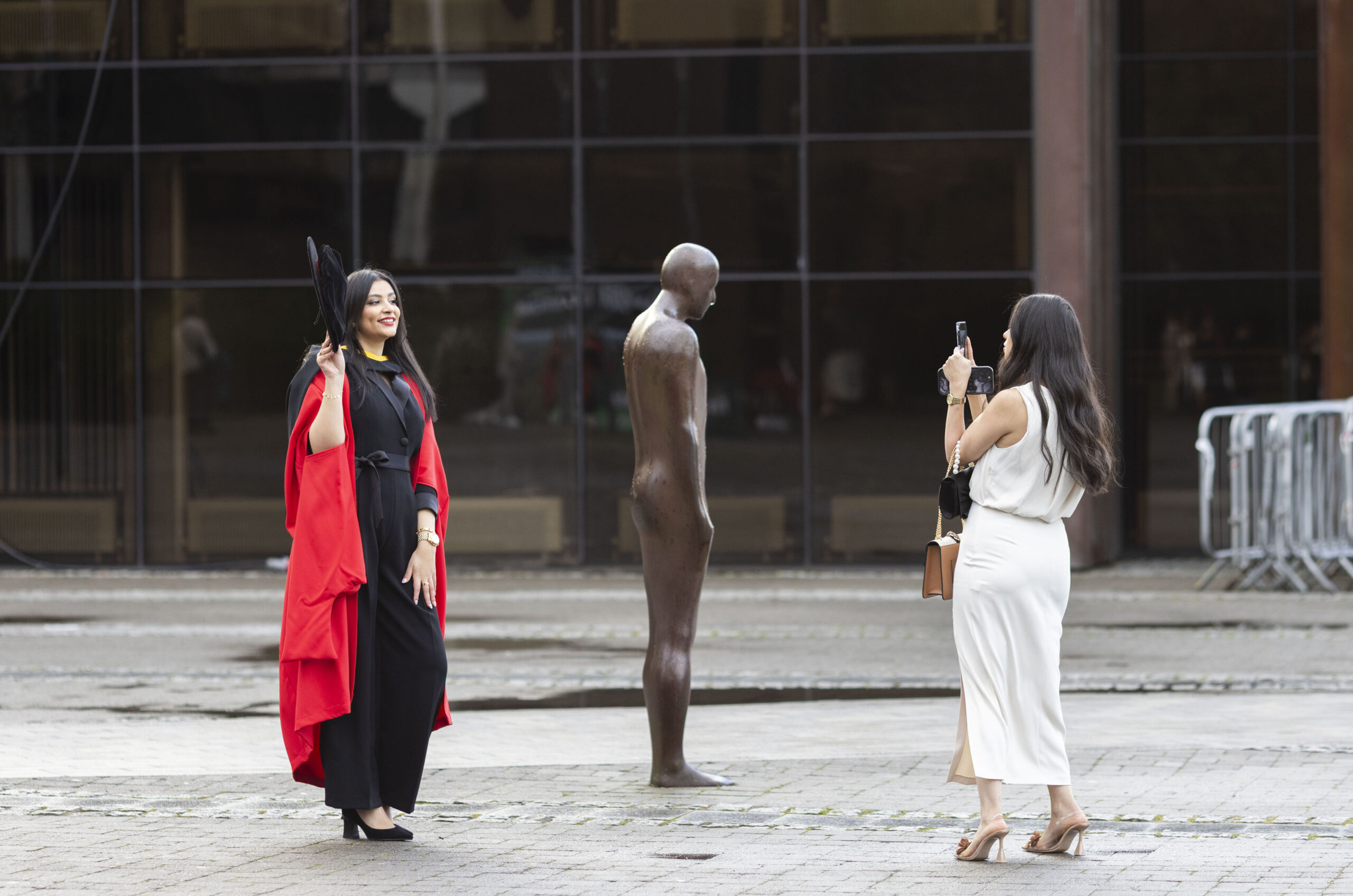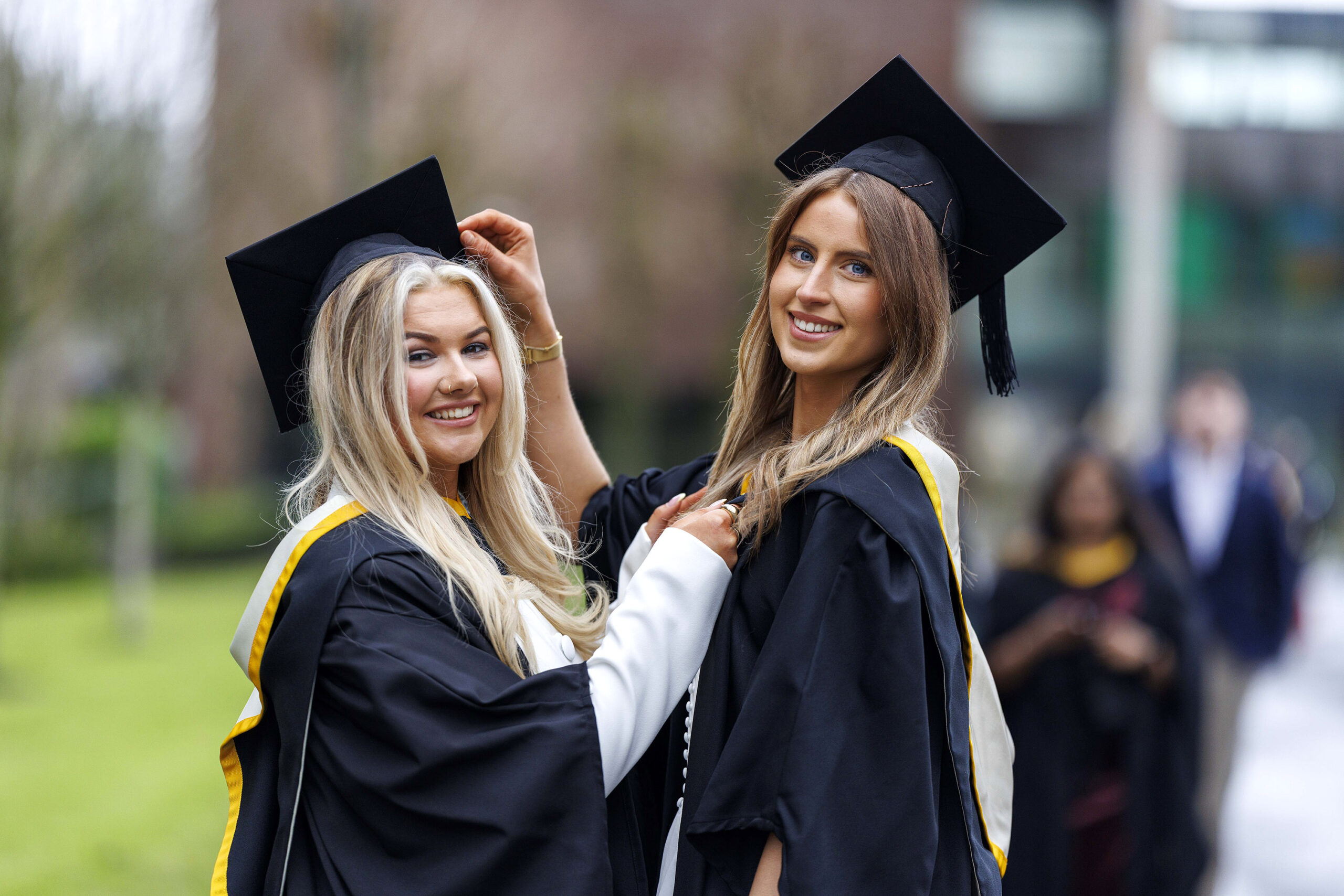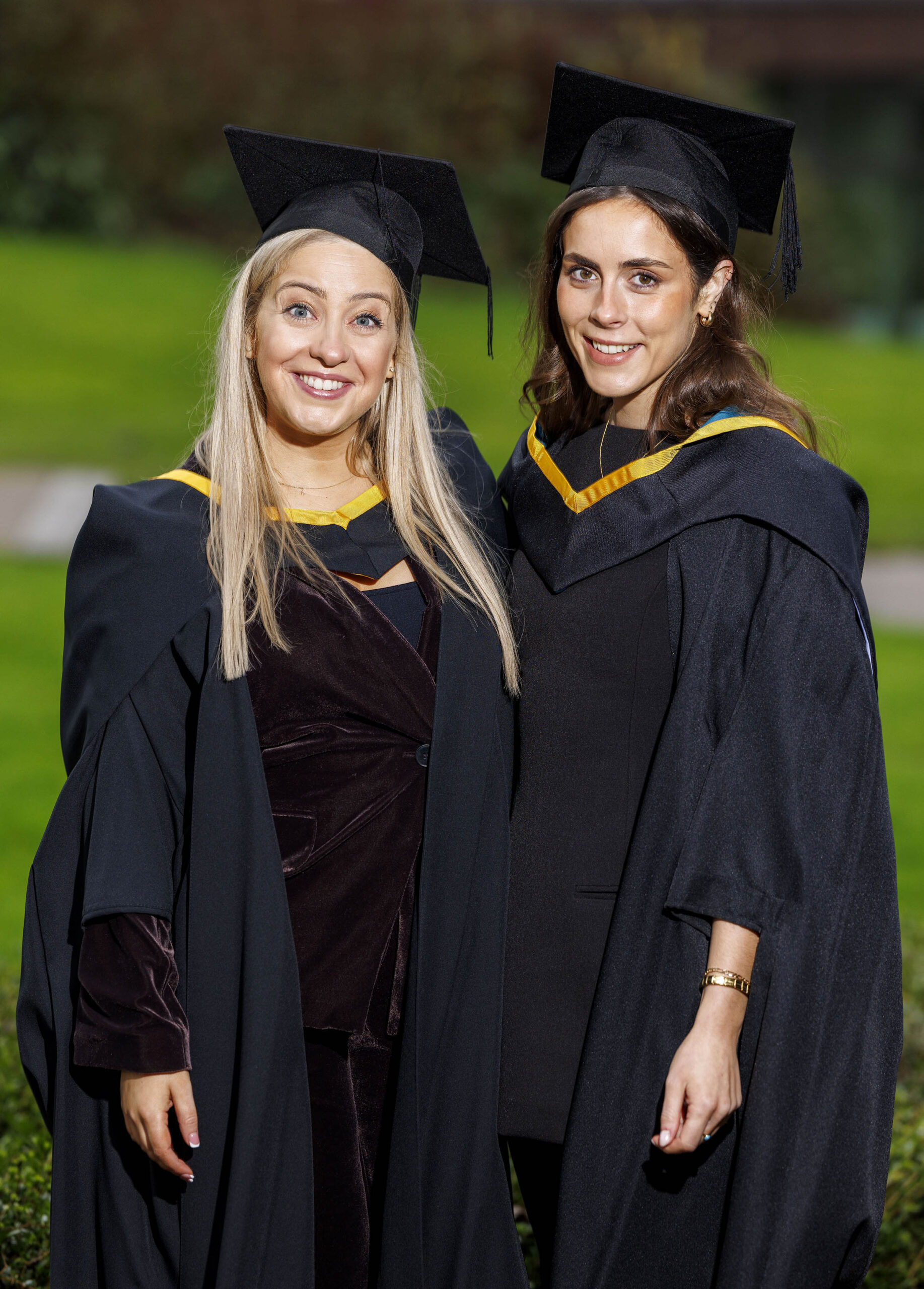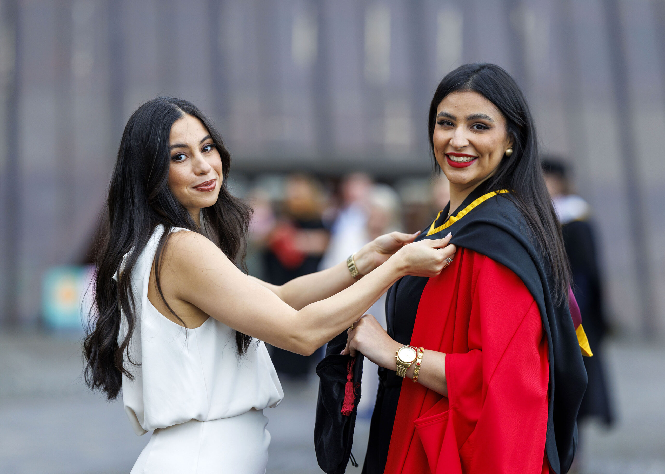 Soumia Chirouf (right) PhD in Linguistics with her friend Rayiane Filali at UL's 2026 winter conferring ceremony. Photo: Arthur Ellis