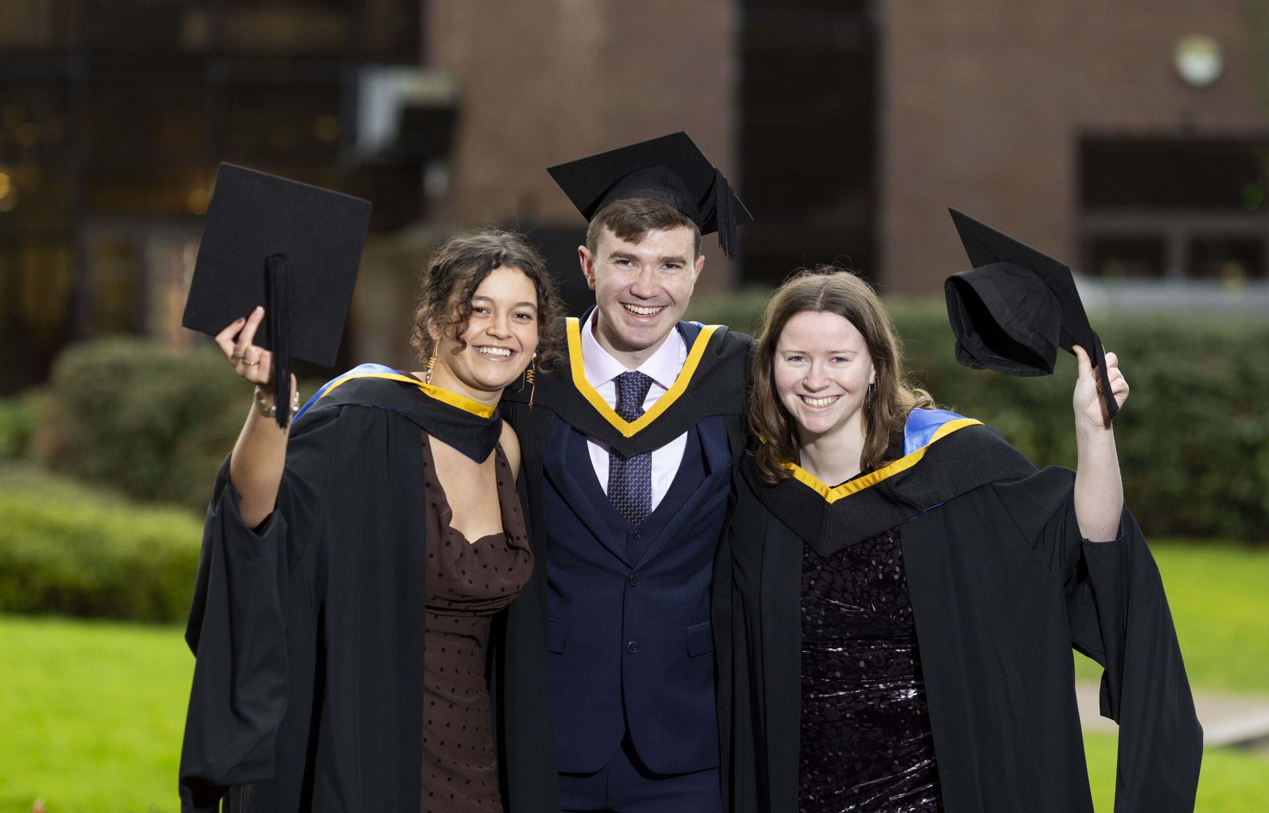 Maria Tellez, Cormac Flynn, Elizabeth Faulkner at UL's 2026 winter conferring ceremony. Photo: Alan Place