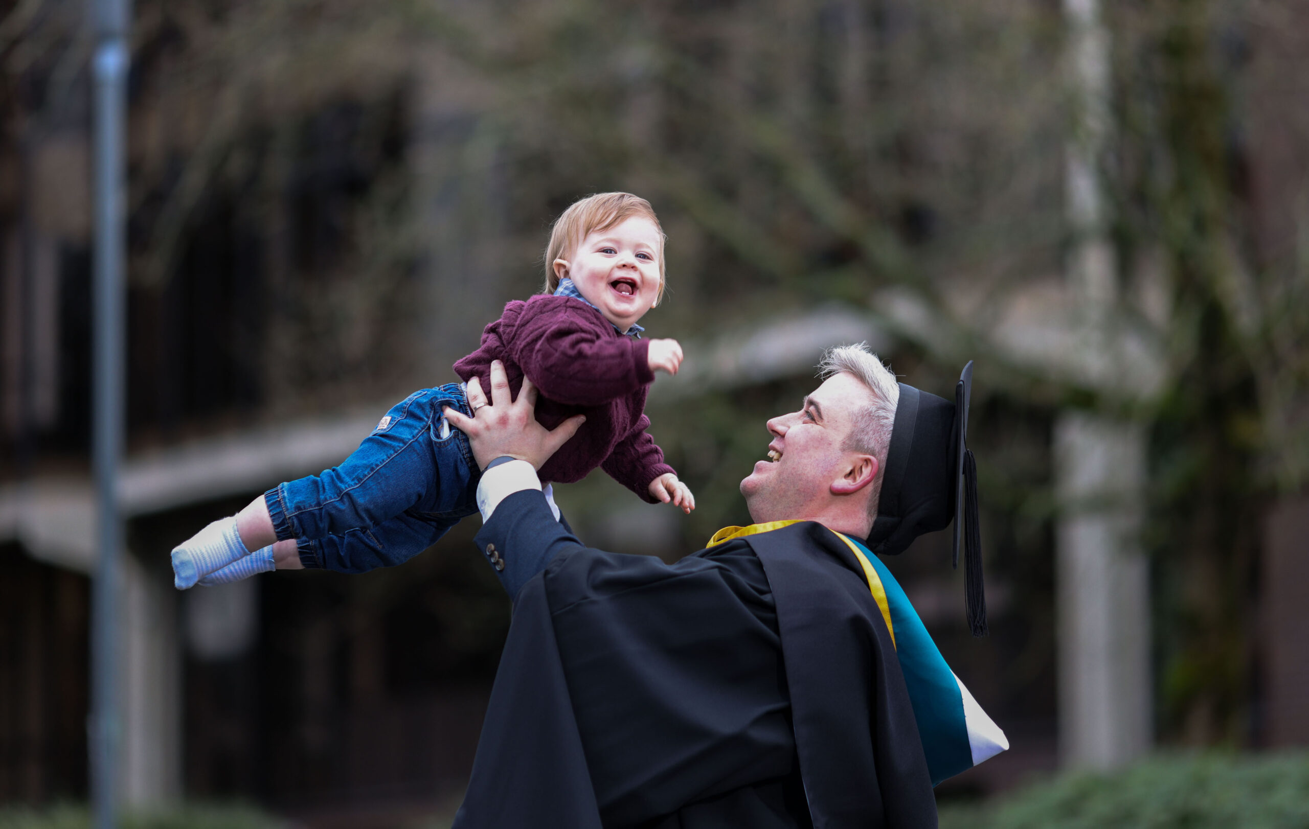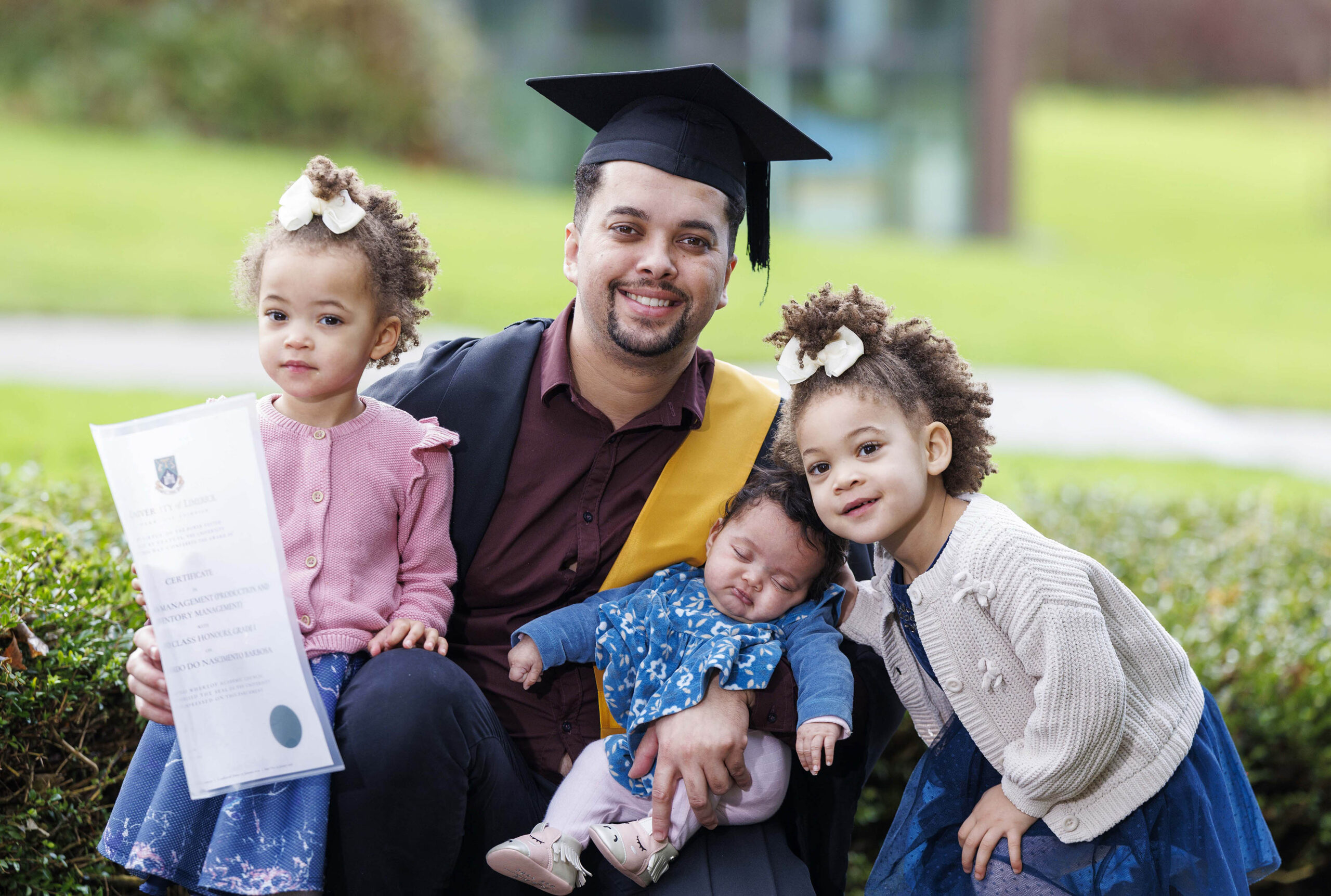 Luis Barbosa with his daughters Zoe (3), Zahra (2) and Zaya ( 4 weeks) at UL's 2026 winter conferring ceremony. Photo: Arthur Ellis