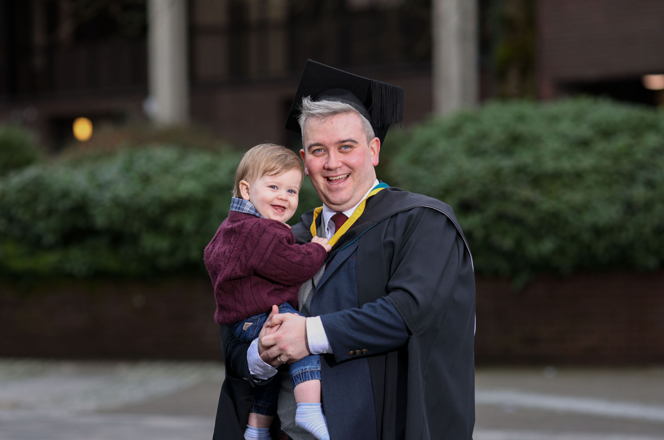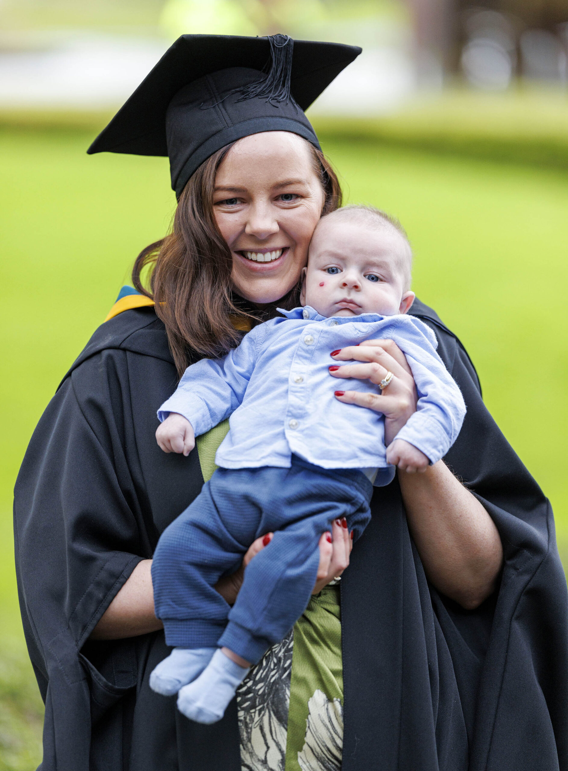 Rebecca Mackey with her 3 month old son Seb at UL's 2026 winter conferring ceremony. Photo: Arthur Ellis