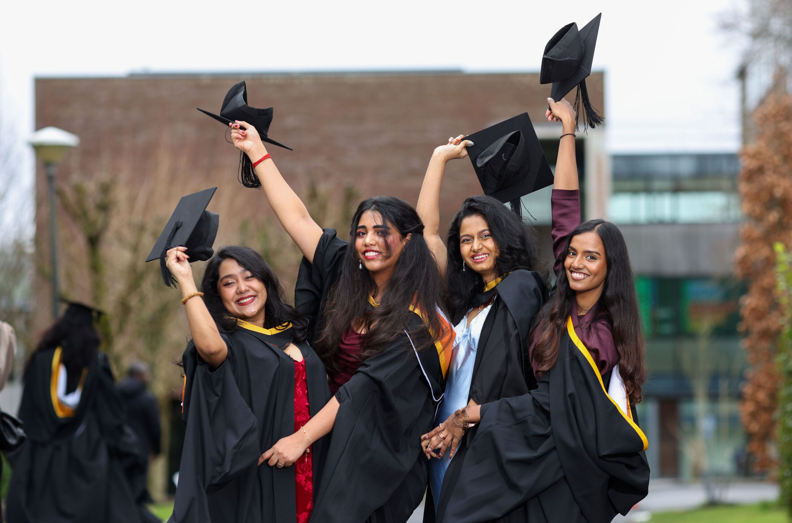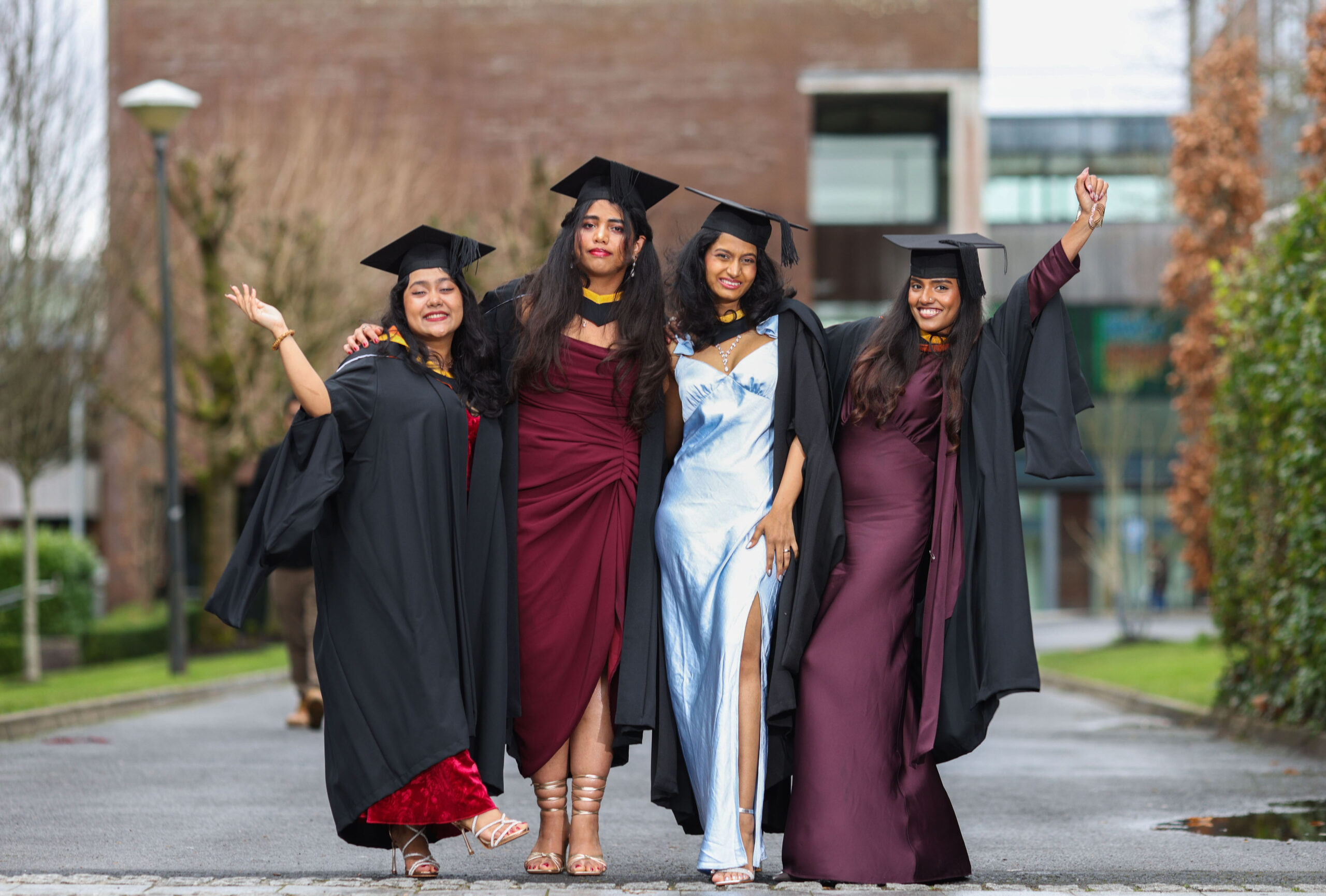 Anamika Guha, Harshita Ramesh, Rutika Hankare, and Aswathi Narikkuyil Raghavan at UL's 2026 winter conferring ceremony. Photo: Alan Place