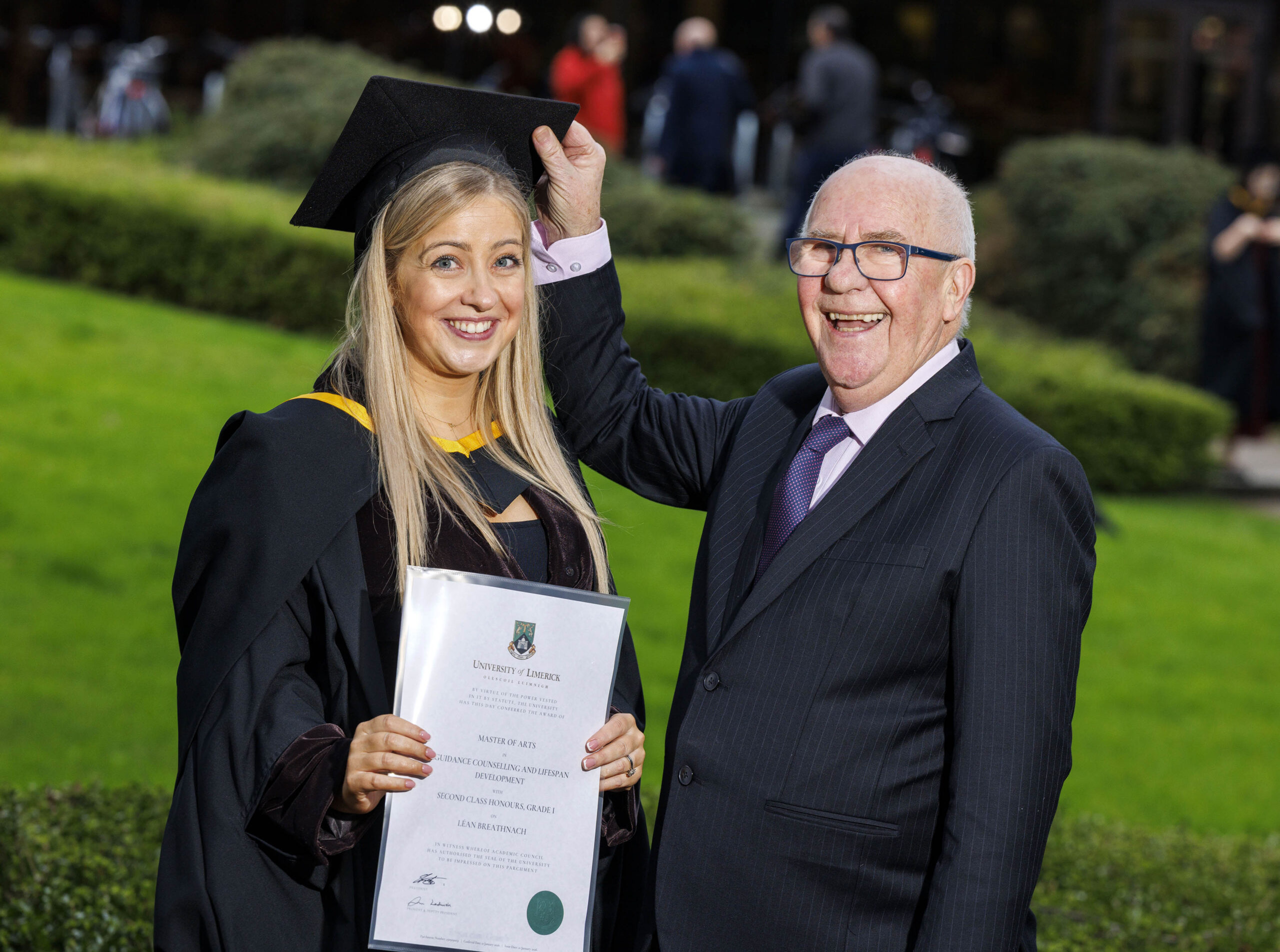 Léan Breathnach with her dad, broadcaster Seán Bán Breathnach at UL's 2026 winter conferring ceremony. Photo: Arthur Ellis