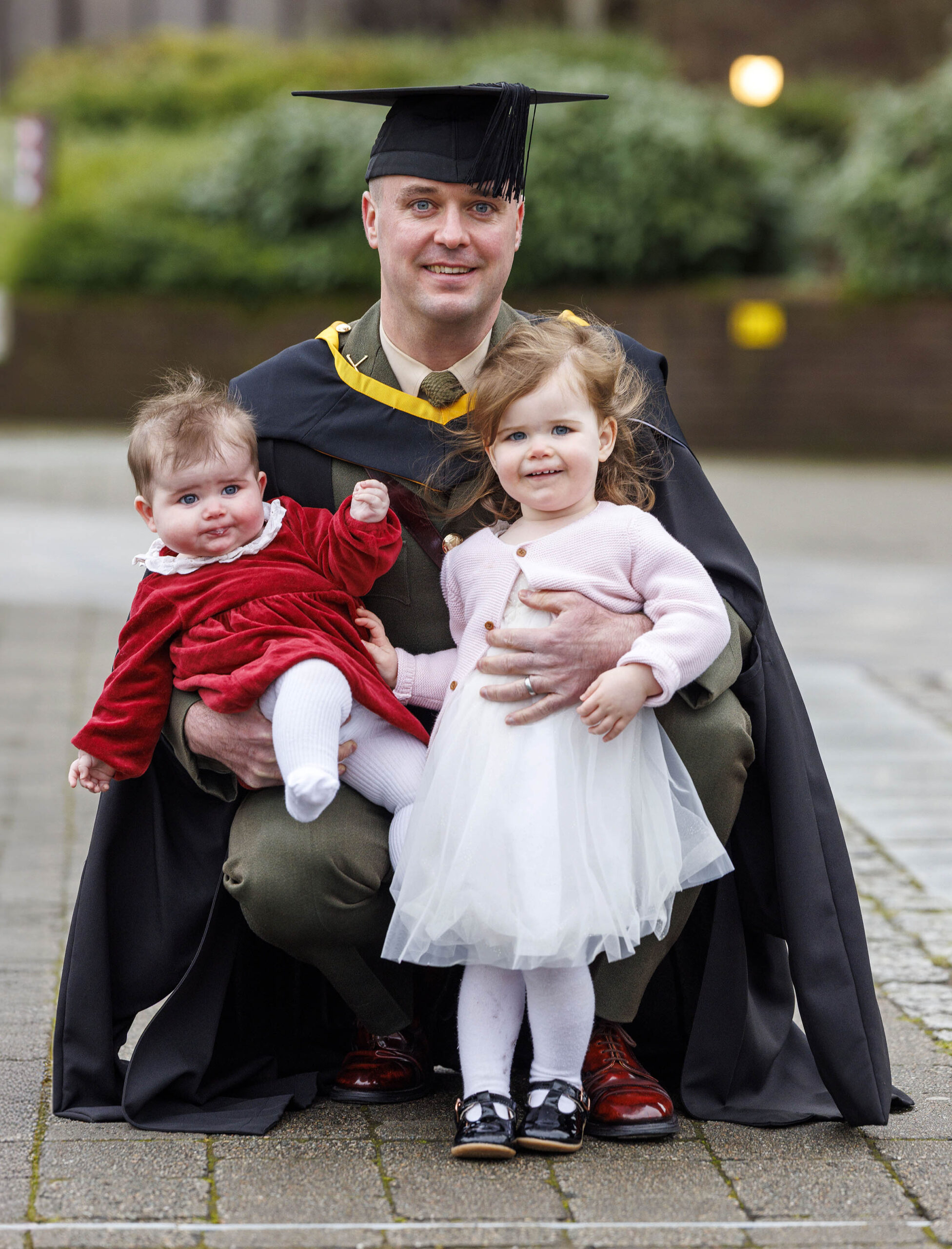 Comdt Derek Farrellwith his daughters Leah and Ava at UL's 2026 winter conferring ceremony. Photo: Arthur Ellis