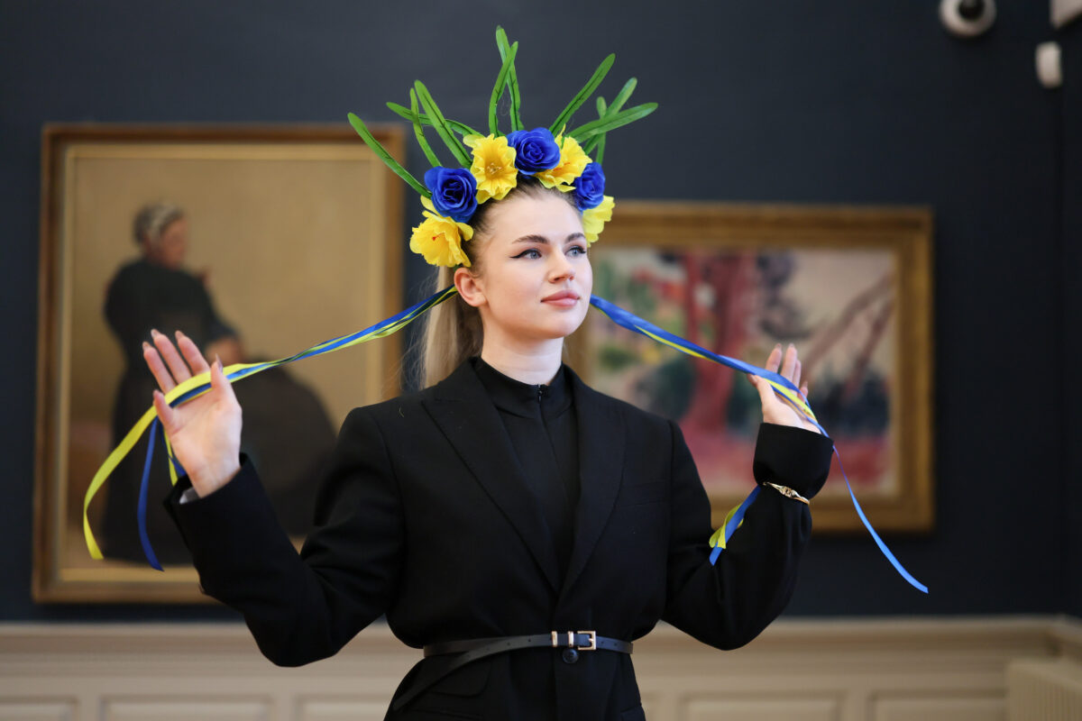 Marina Manika with a traditional Ukrainian head piece at the Ukrainian traditional arts session in the Hunt Museum at the PURE Limerick Arts Festival. Photo: Eamon Ward.