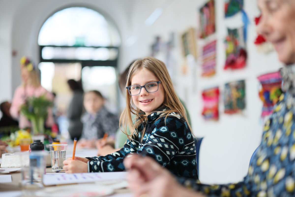 Saoirse Wright taking part in an arts class with her grandmother Anne Kerin in the Hunt Museum at the PURE Limerick Arts Festival. Photo: Eamon Ward.