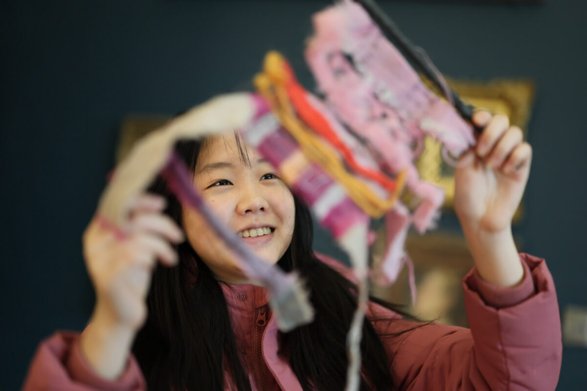Anna Li with her creation at the Textile Weaving for All class in the Hunt Museum at the PURE Limerick Arts Festival. Photo: Eamon Ward.