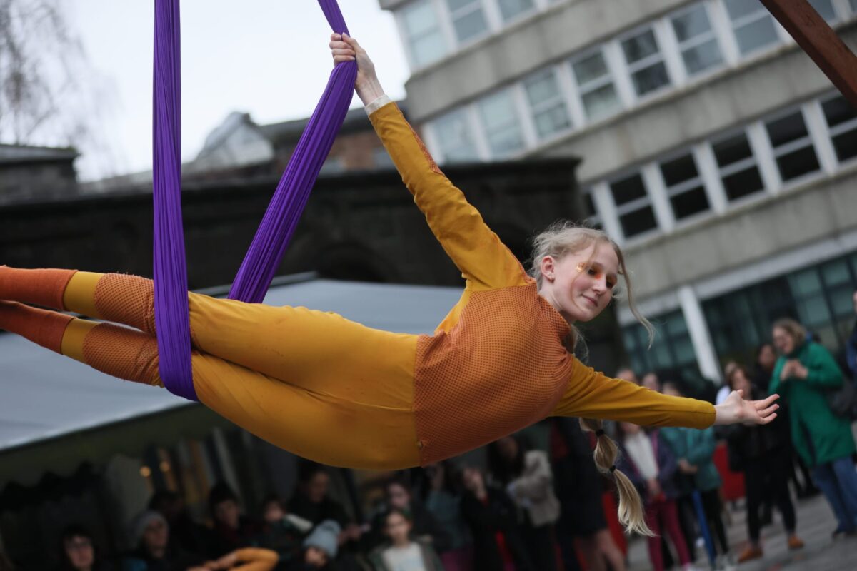 The rain did not put off Irish Aerial Creation Centre’s Future Creators who performed like pros in the Hunt Museum Garden at the PURE Limerick Arts Festival. Photo: Eamon Ward.