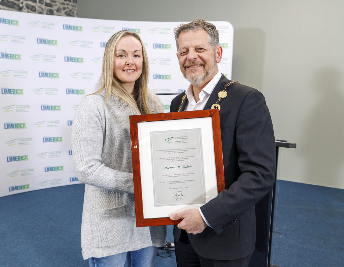 Included in the mayoral honours list were Ireland’s youngest ever female national marathon champion Ava Crean (who is set to grand marshall this year’s St Patrick’s Day parade; 2025 Gaynor Cup winners, the Limerick District Schoolgirl U14 Team; Limerick Sport Huskies, for thir outstanding achievement in this year’s Domino’s Women’s Division 1 National Cup; three-time world handball title winner Martina McMahon; World Schools Basketball champions for 2025 the Mungret Community College Girls U19 basketball team; and the Munster Wheelchair Hurling Camogie Club, who secured the 2025 wheelchair hurling camogie All-Ireland title in 2025.