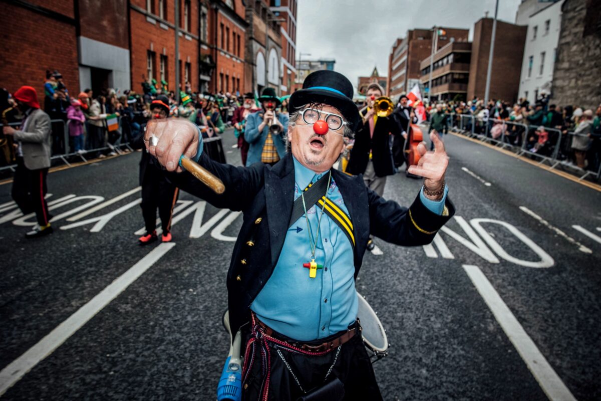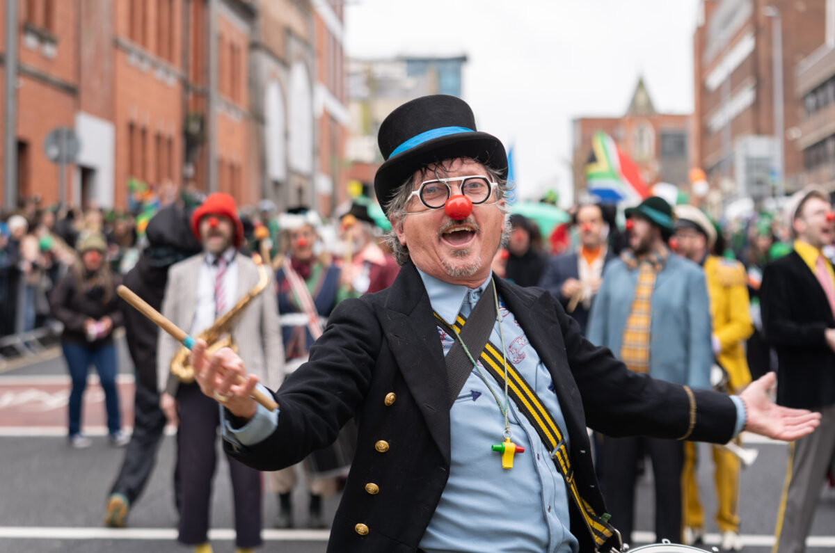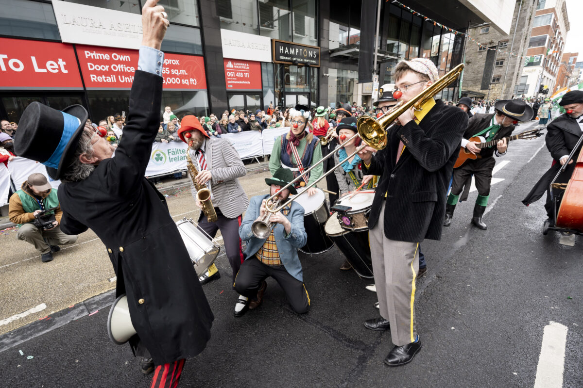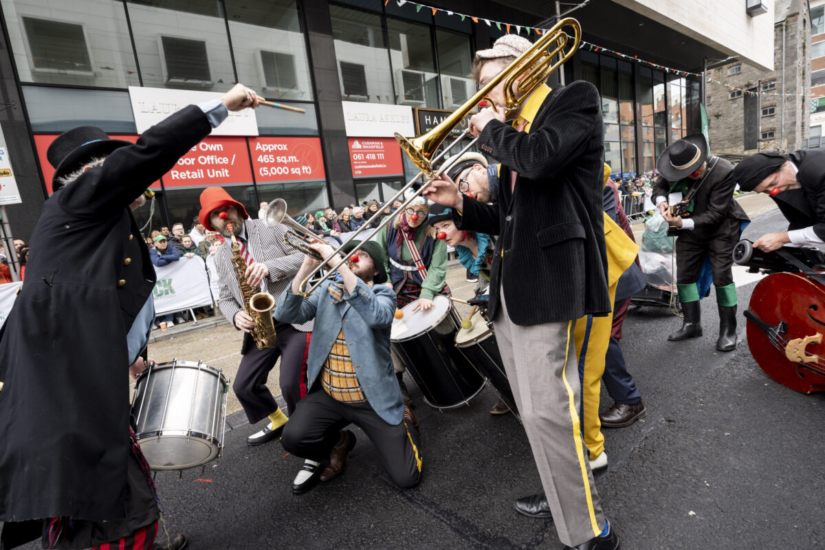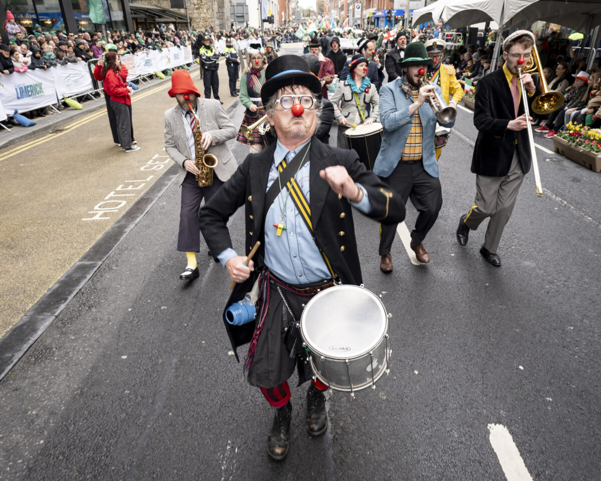 Performers from the Irish National Clown Orchestra pictured at St Patrick's Day Paraade in Limerick City where runner Ava Crean was Grand Marshal.