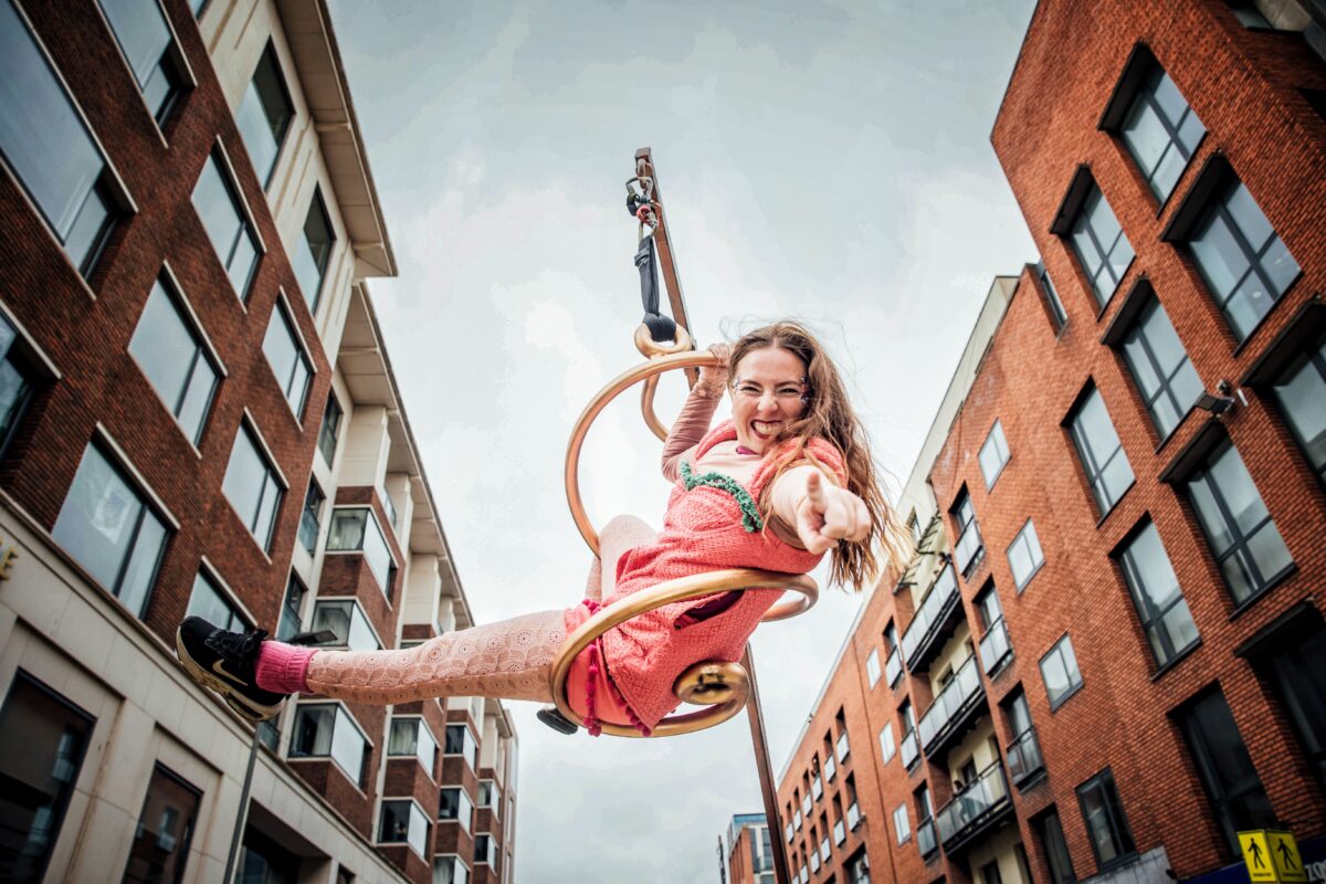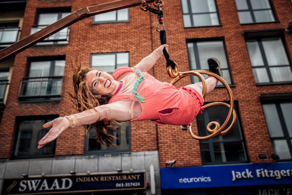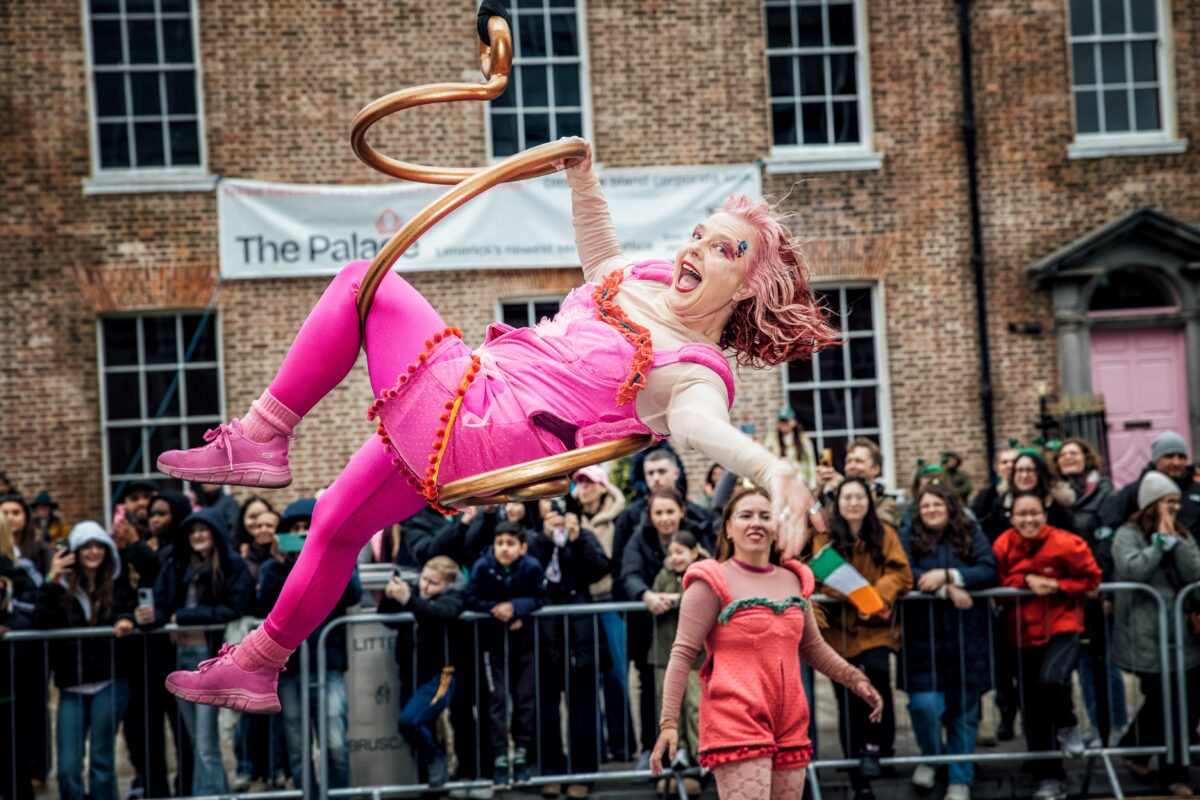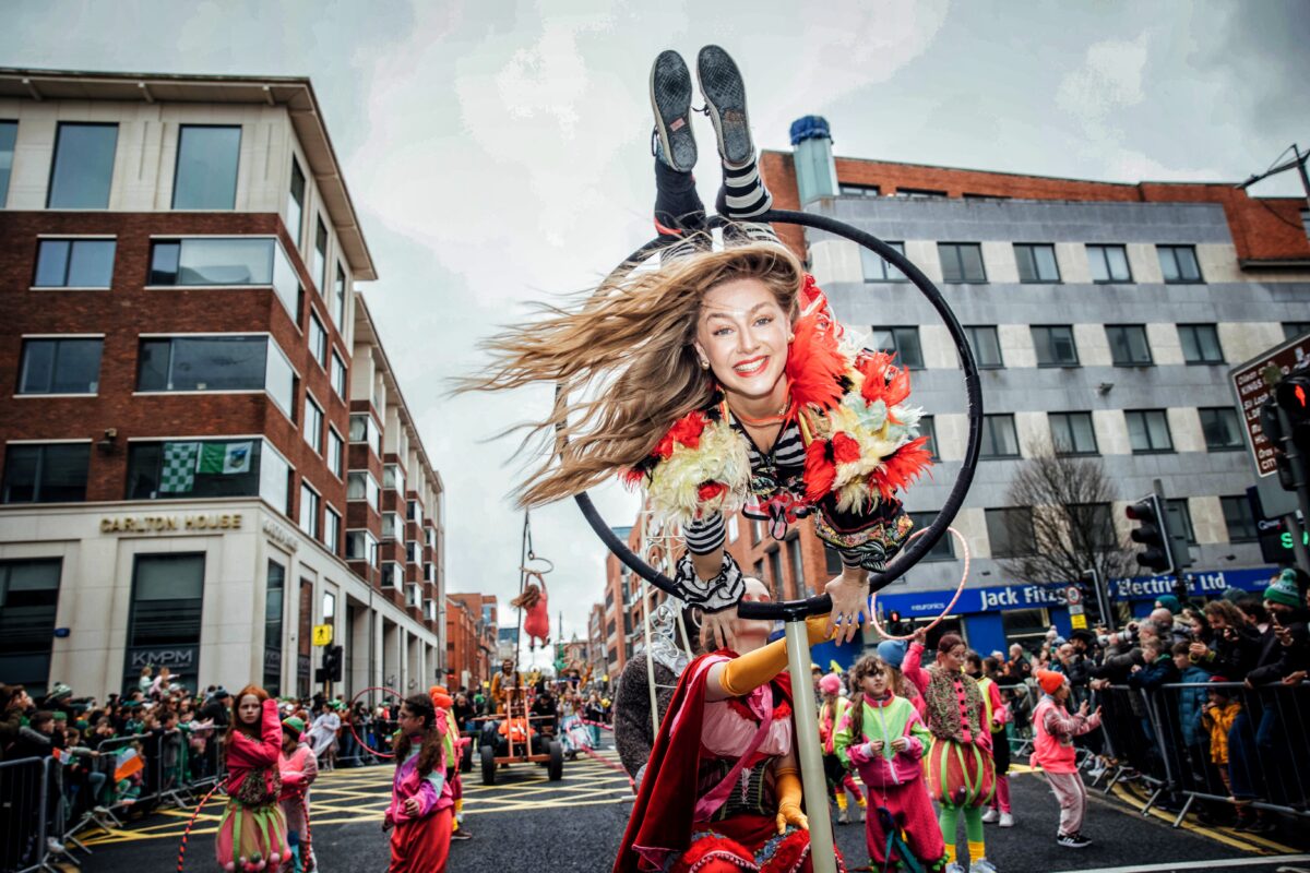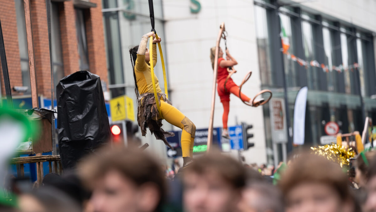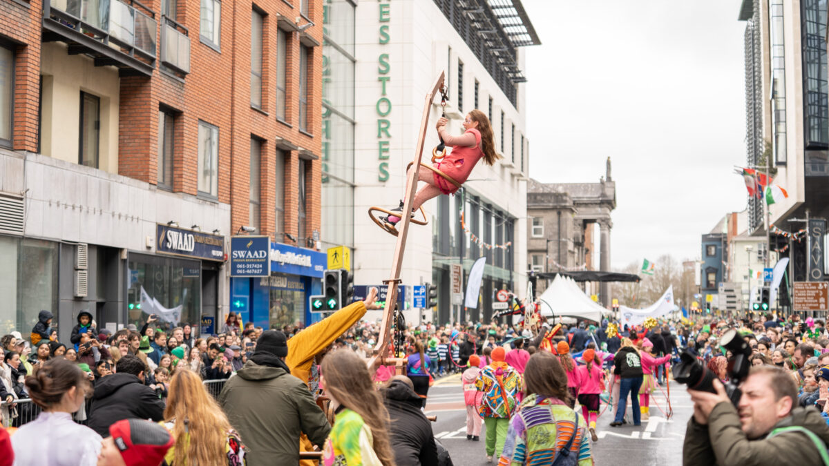 Performers from Fidget Feet Aerial Bance pictured at St Patrick's Day Paraade in Limerick City where runner Ava Crean was Grand Marshal.Photo: Don Moloney.