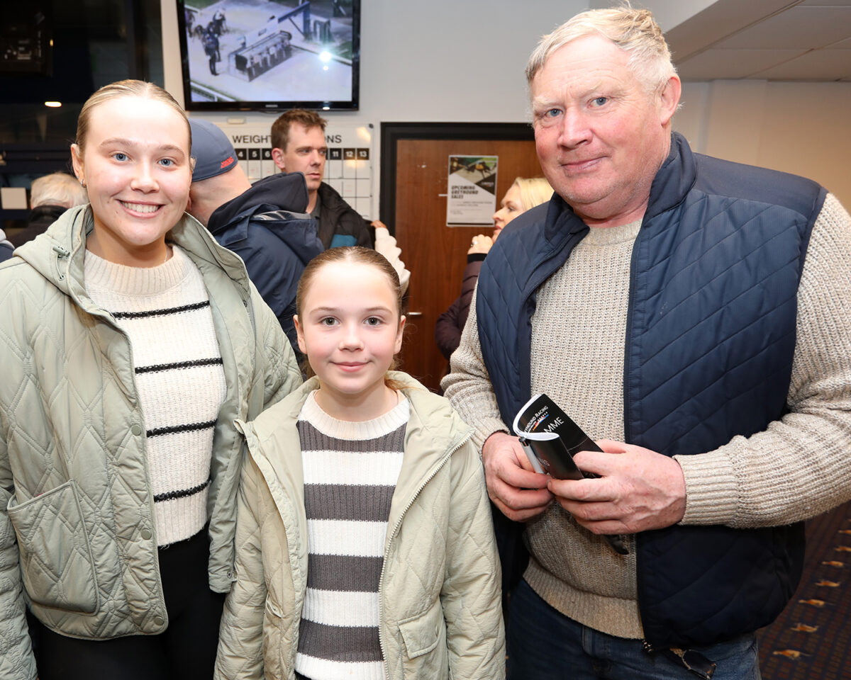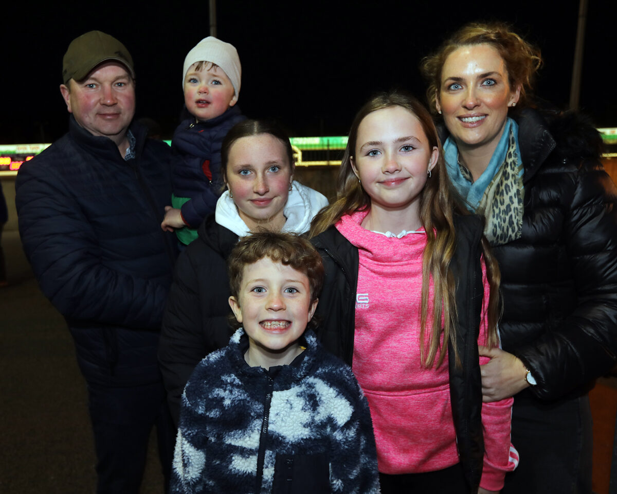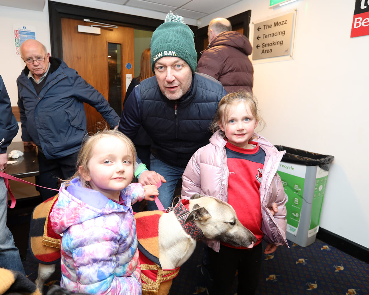 Eabha, Cara and John Mullane with the retired greyhounds at the Con and Annie Kirby Classic. Photo: Brendan Gleeson.