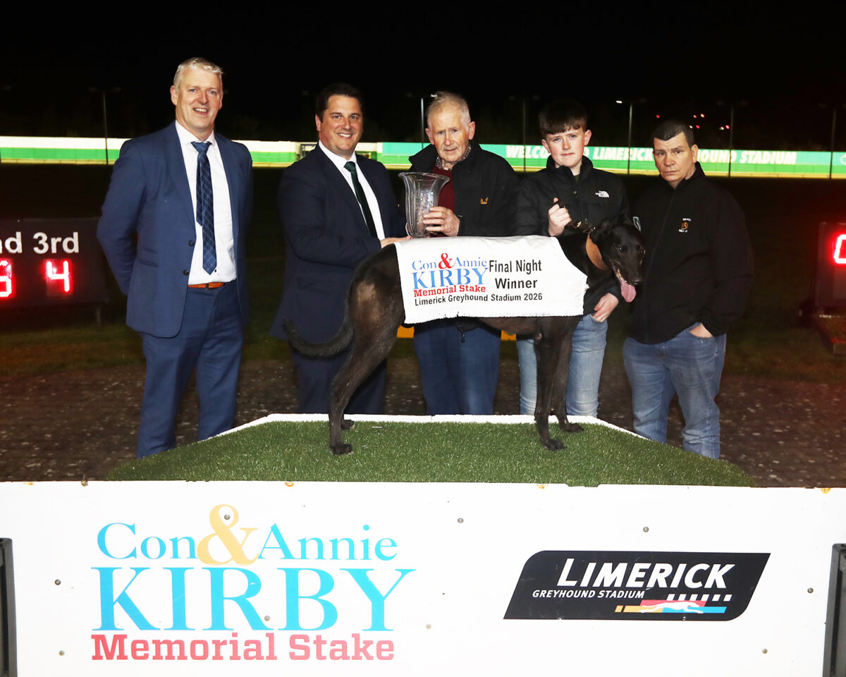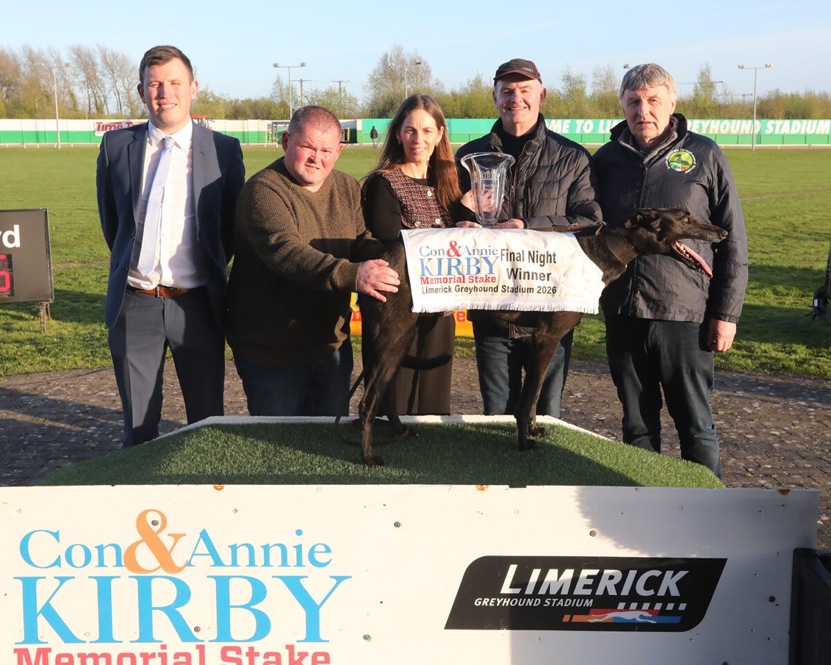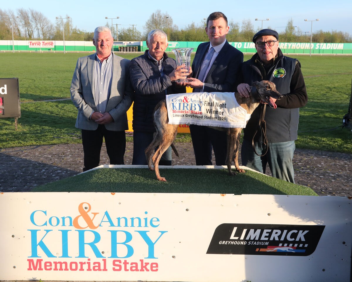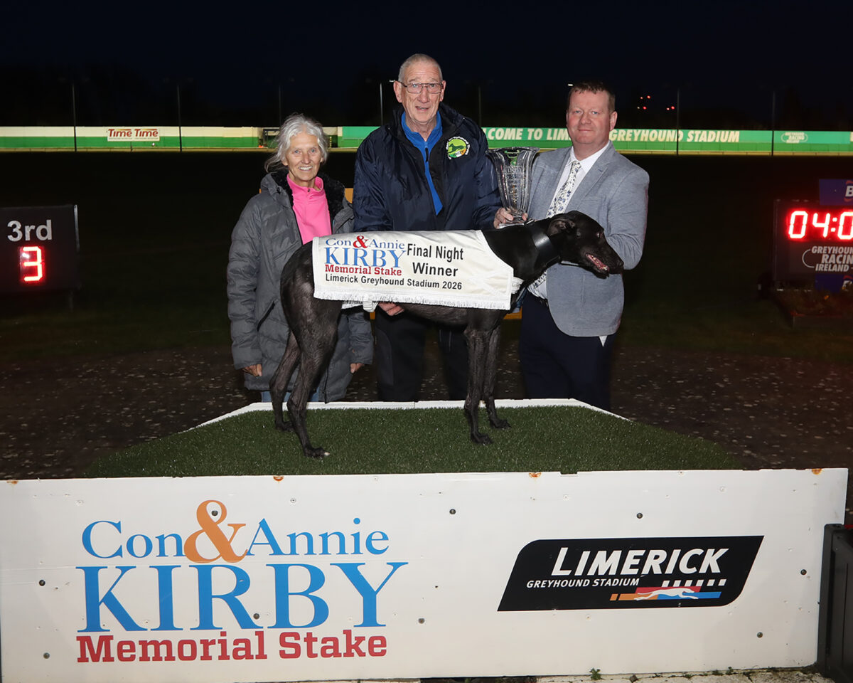 BOUNCING Monarch set a new track record of a sizzling 27.77 seconds to capture the 2026 Con and Annie Kirby Final, supported by JP and Noreen McManus, at Limerick Greyhound Stadium.