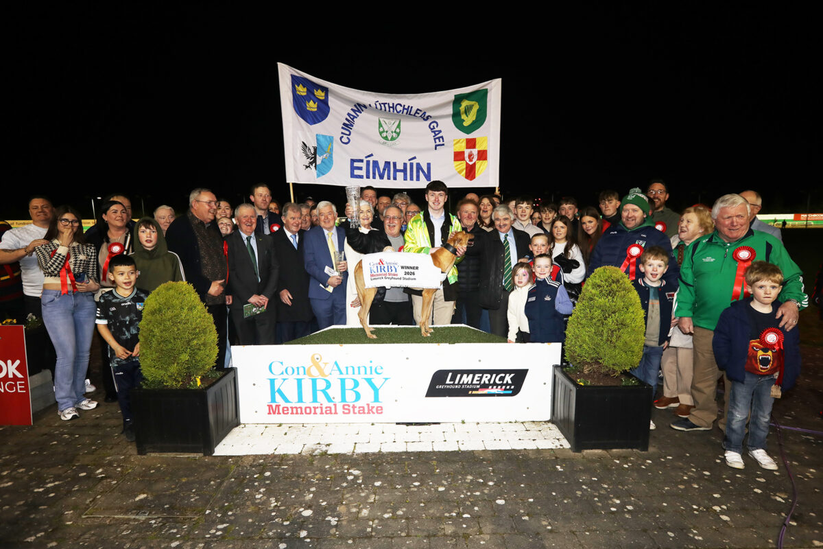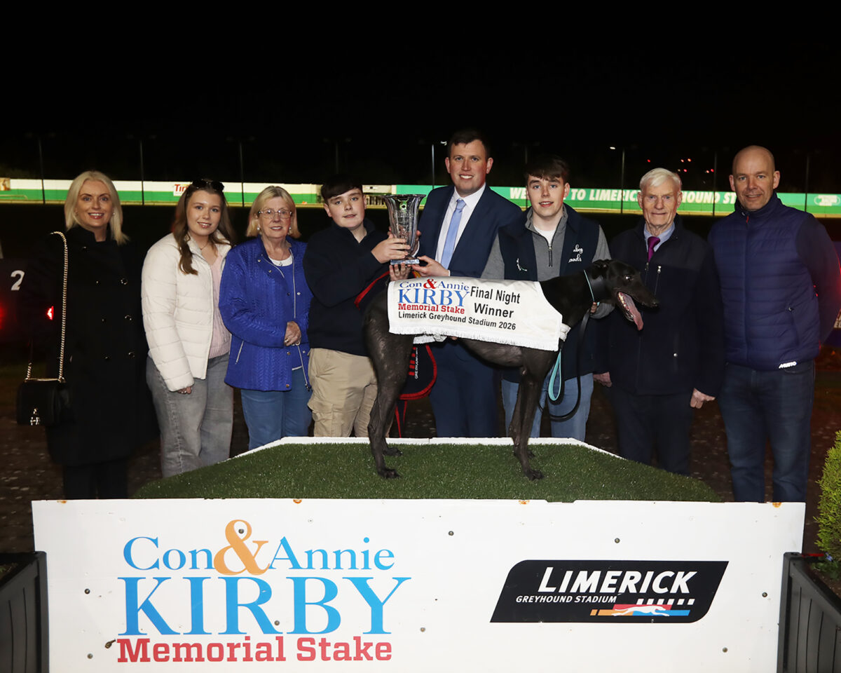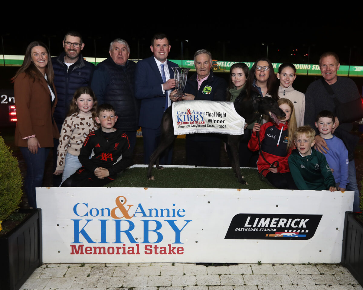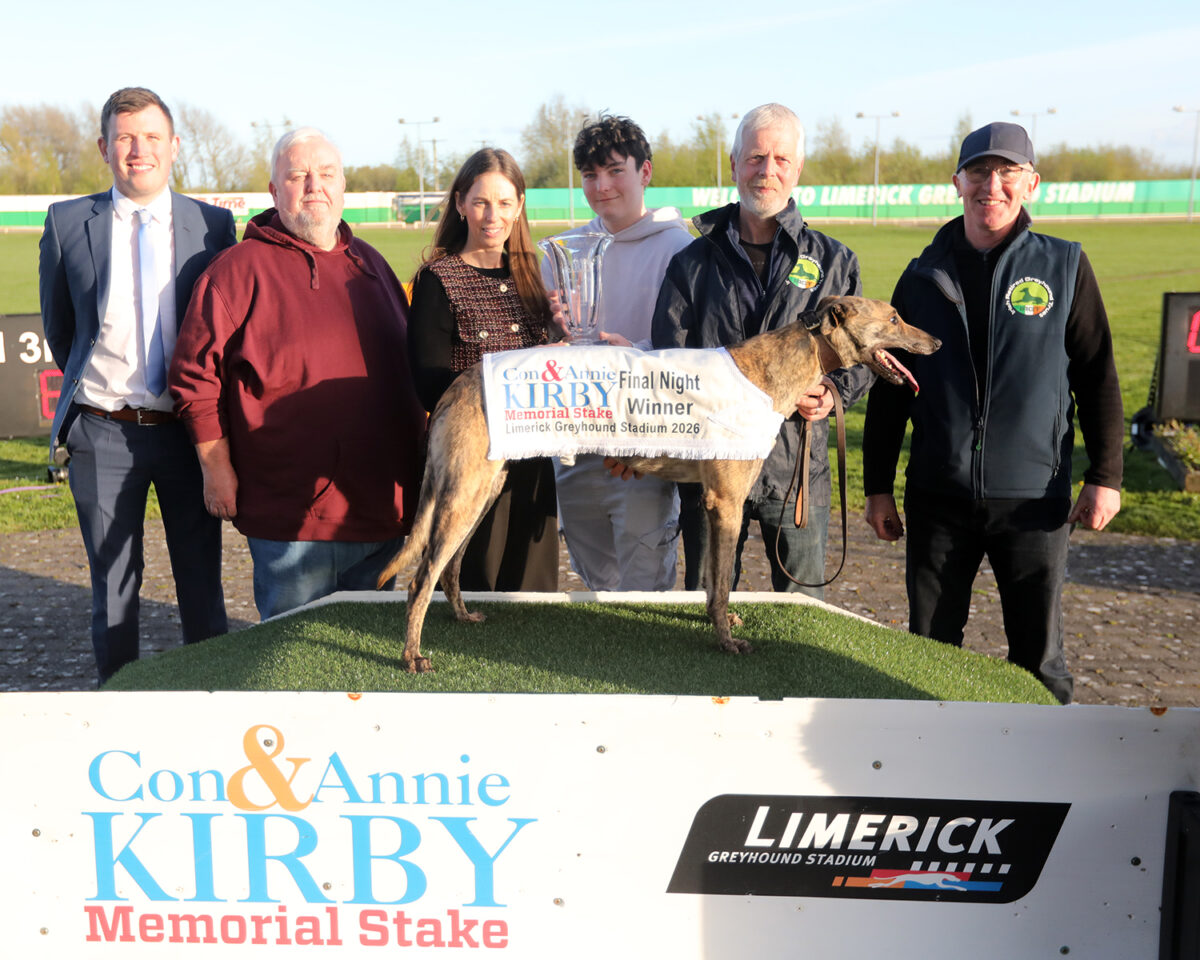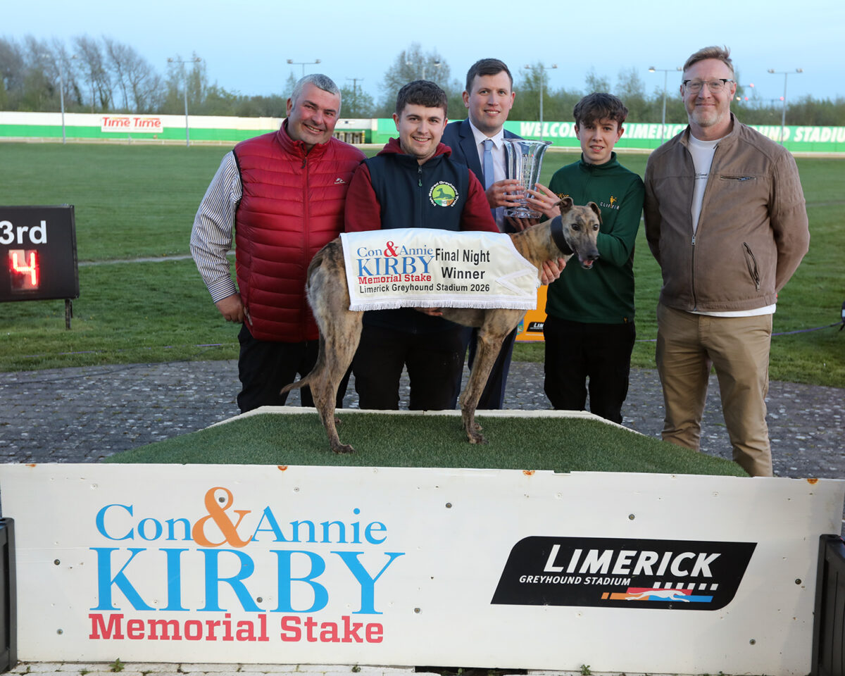 BOUNCING Monarch set a new track record of a sizzling 27.77 seconds to capture the 2026 Con and Annie Kirby Final, supported by JP and Noreen McManus, at Limerick Greyhound Stadium.