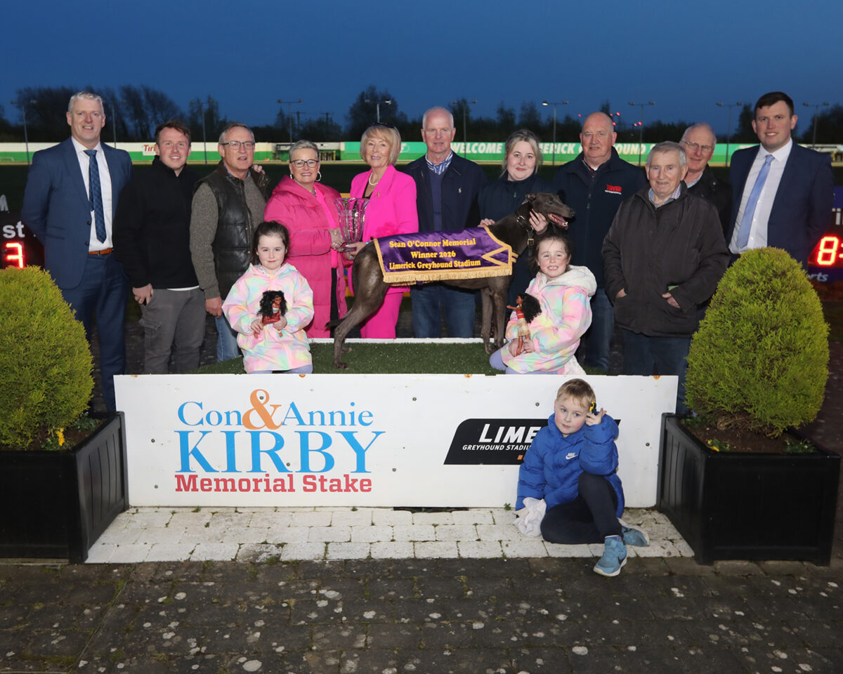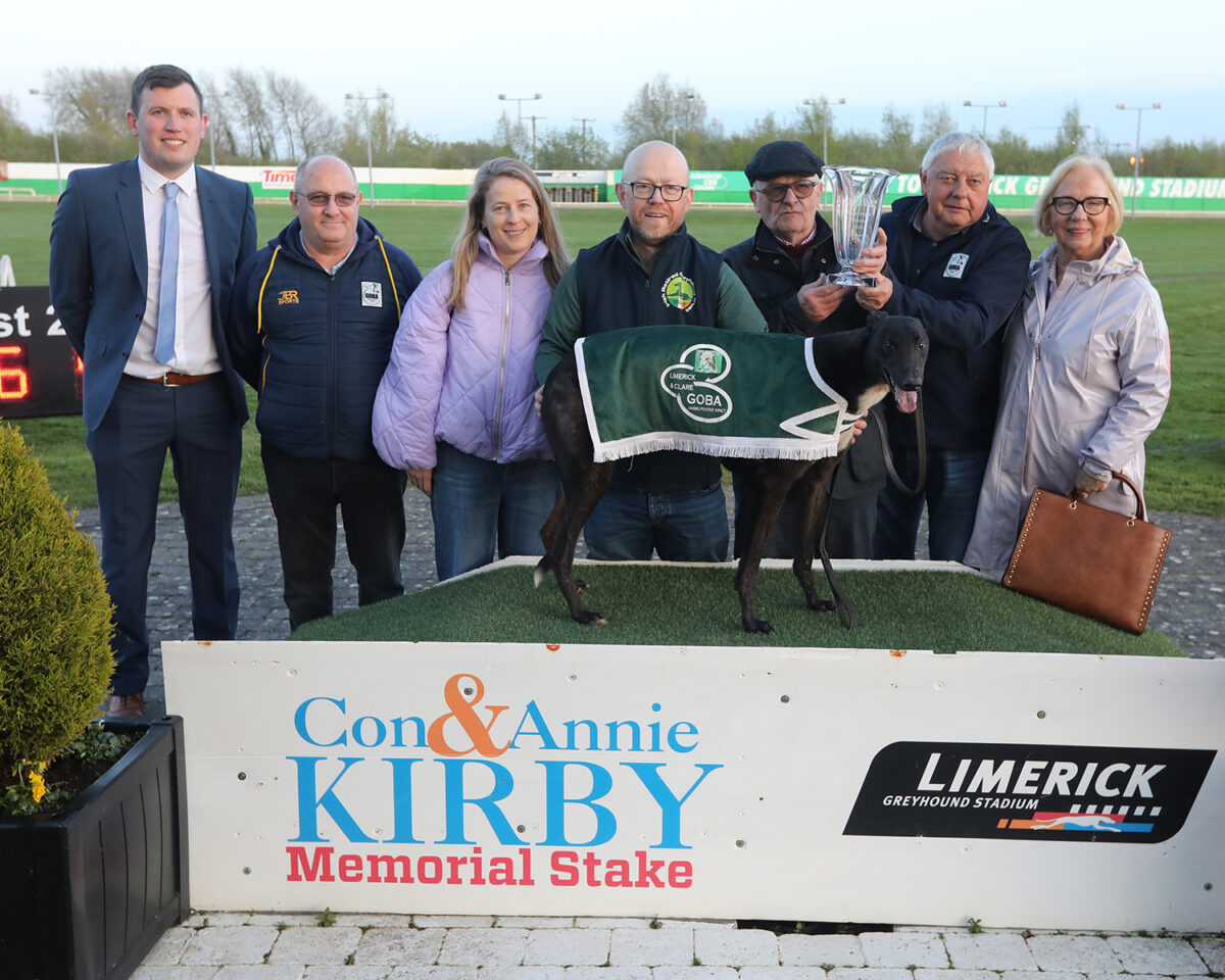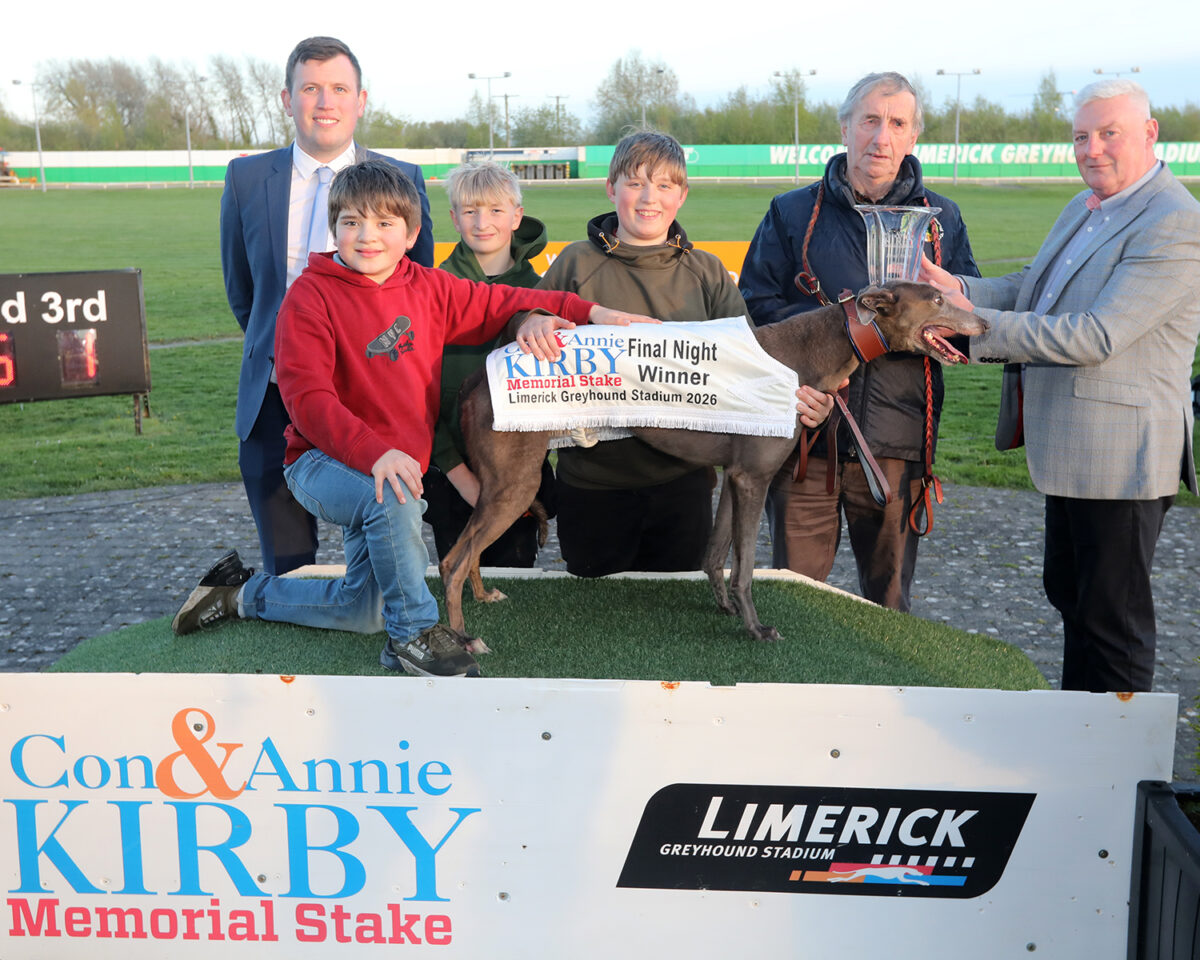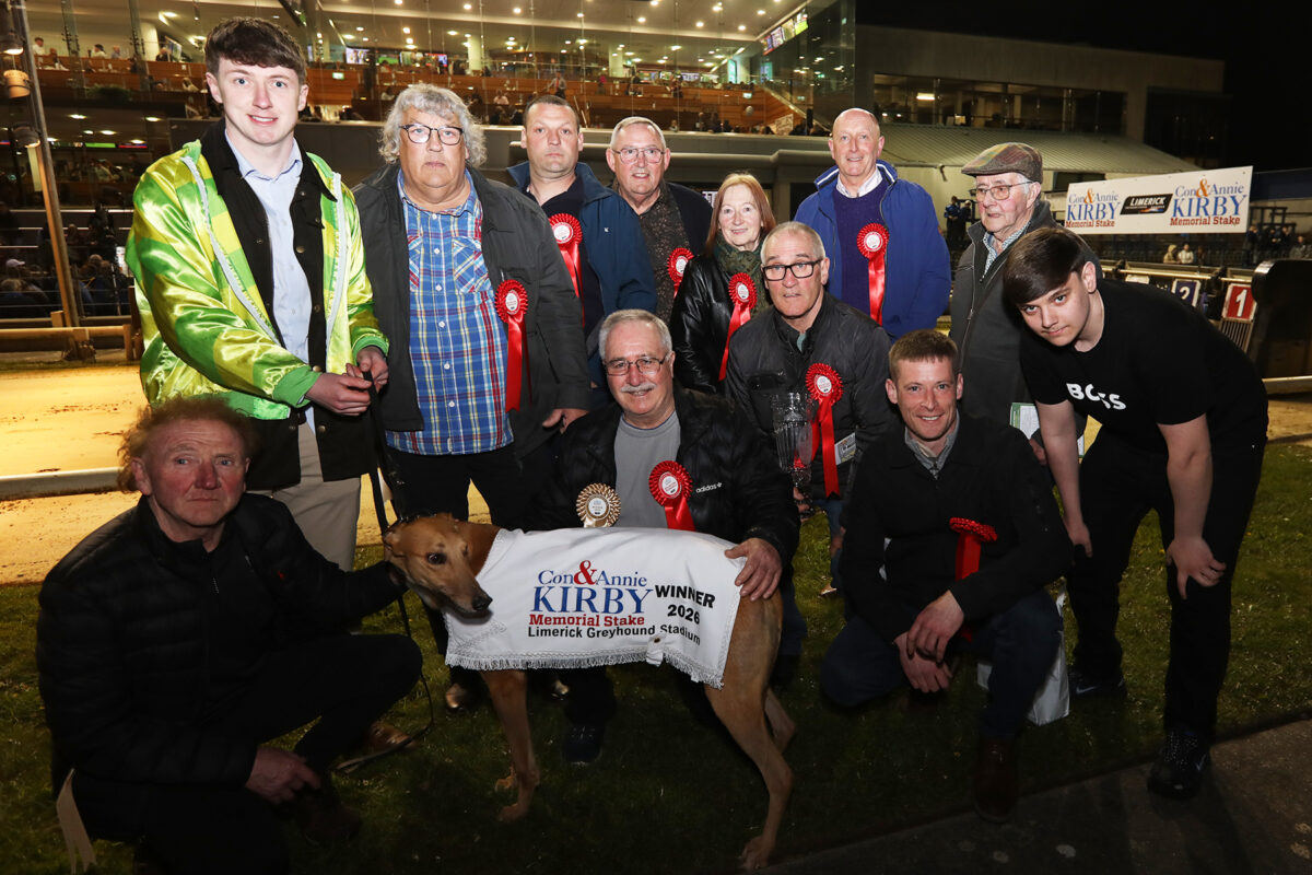 BOUNCING Monarch set a new track record of a sizzling 27.77 seconds to capture the 2026 Con and Annie Kirby Final, supported by JP and Noreen McManus, at Limerick Greyhound Stadium.